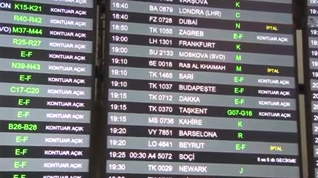 Ortadoğu’da başlayan İsrail-İran gerilimi, bölge hava sahalarının kapanmasına yol açarken Türk havayolu şirketlerinin operasyonlarını da etkiledi ve etkilemeye devam ediyor. Güvenlik riski gerekçesiyle İstanbul Havalimanından Ortadoğu’ya yapılmayan ve iptal olan uçuşlar havalimanı içerisinde bulunan ekranlara yansıtıldı.
